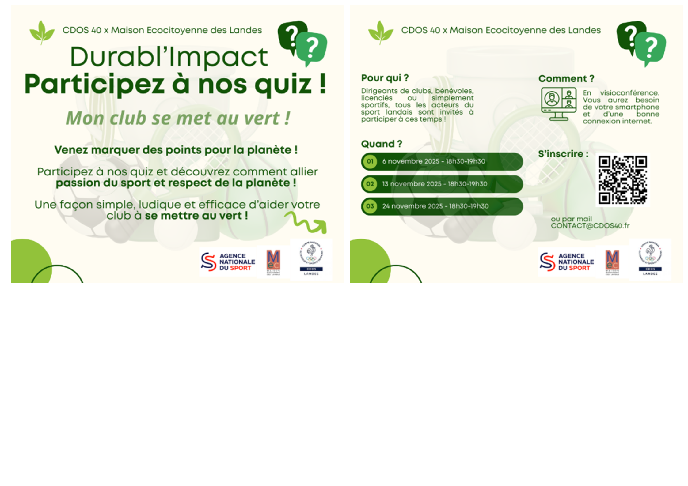 Le CDOS 40 a relancé son action Durabl’Impact pour accompagner les clubs landais dans leur transition environnementale. Pour cette 4ème édition du dispositif, nous nous associons à la Maison Ecocitoyenne des Landes pour proposer des temps simples et ludiques.